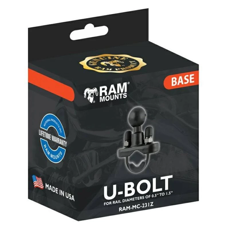 The RAM-MC-231ZU consists of a 1″ rubber ball designed to sit at right angles to the mounting rail. The zinc coated metal u-bolt accommodates rails in diameter from 0.5″ to 1.25″ in diameter. Included are black cover caps to be placed over the exposed ends of the u-bolt and a composite adapter that can narrow the rail to a minimum width of 0.5″.